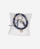 C’est une parure en pierre semi-précieuse: la Sodalite. Elle est composée d’un bracelet pour humain et d’un pendentif pour chien à accrocher au collier. De quoi vous assortir à votre poilu préféré!
