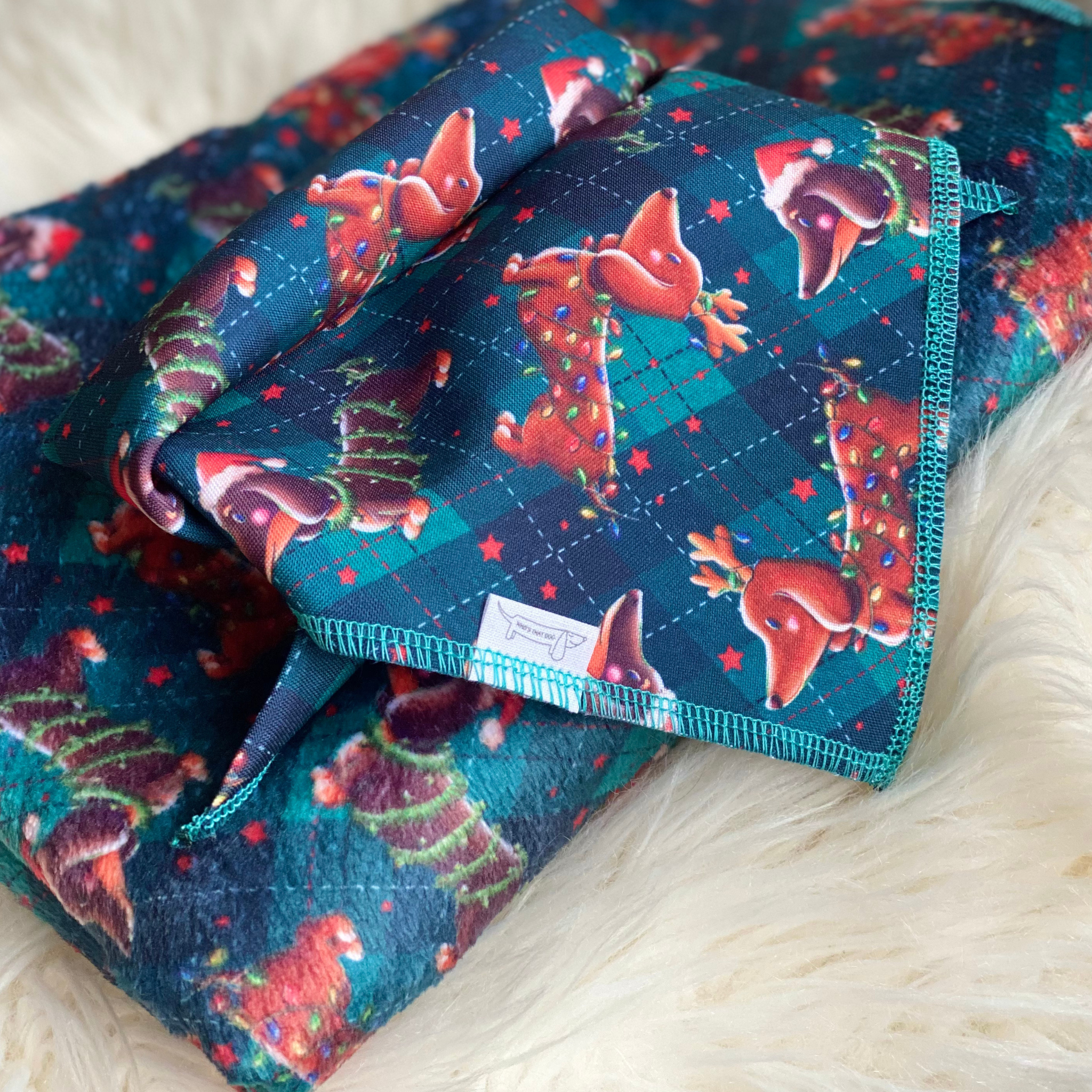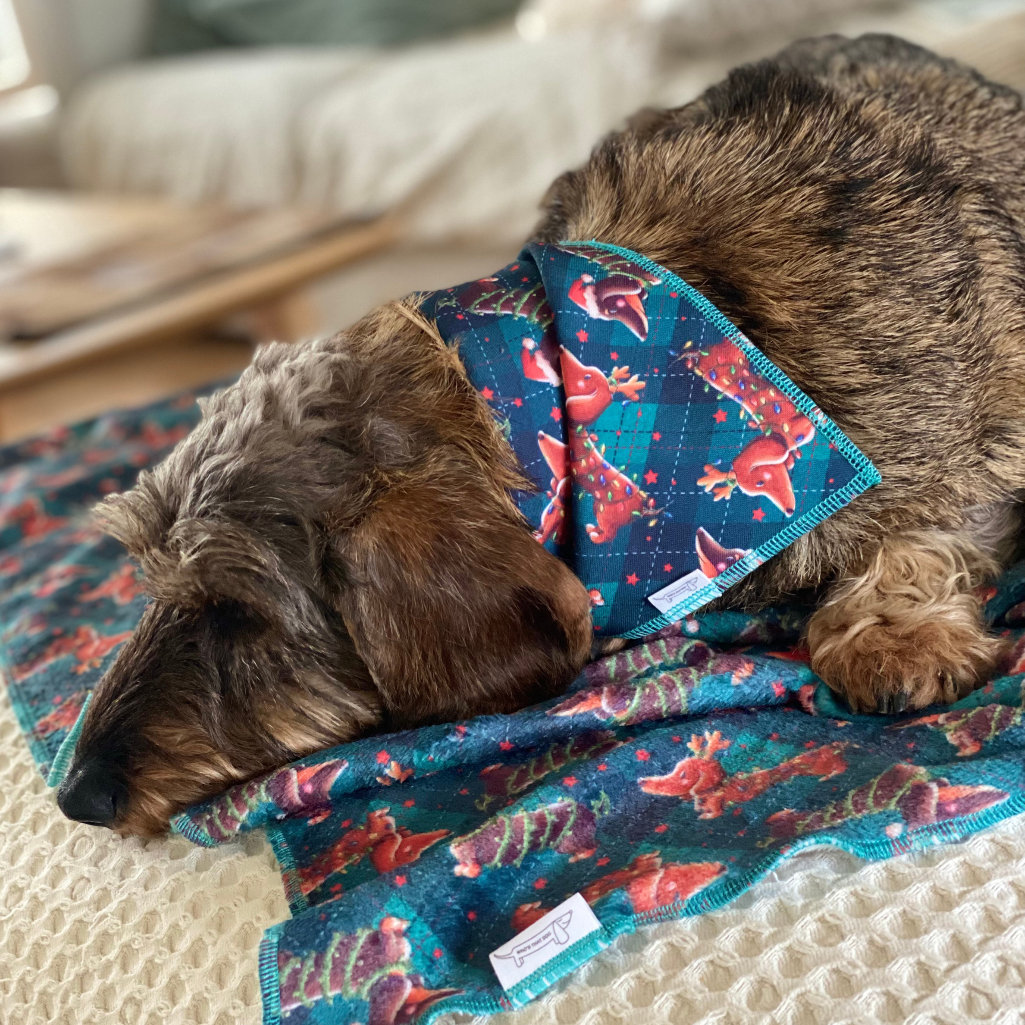 Offrez à votre poilu un look magique pour les fêtes avec notre Duo Noël Teckel – Plaid & Foulard assortis.