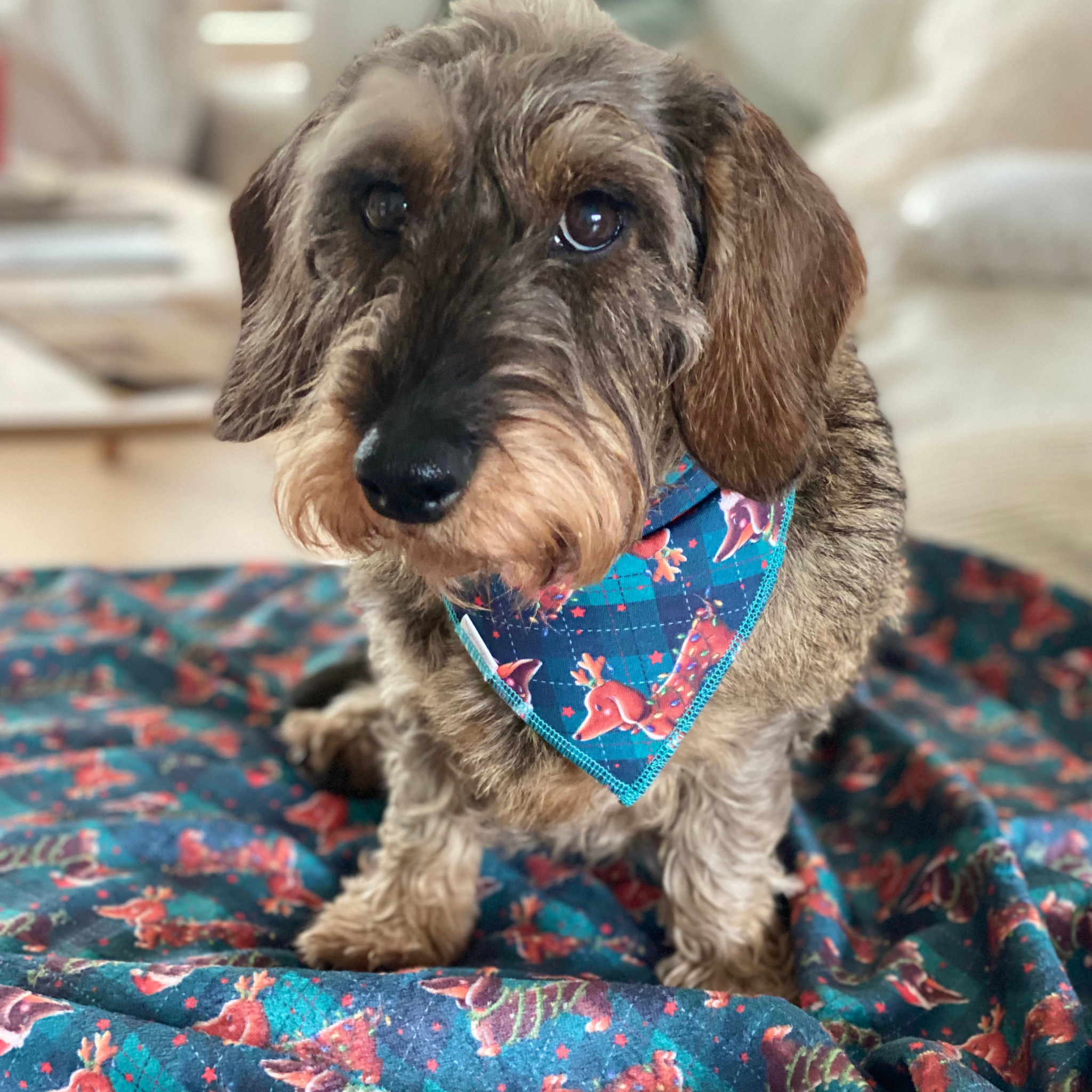Grâce à sa coupe taille unique, il suffit de rouler le foulard pour l’adapter à n’importe quel teckel, du mini au standard.
