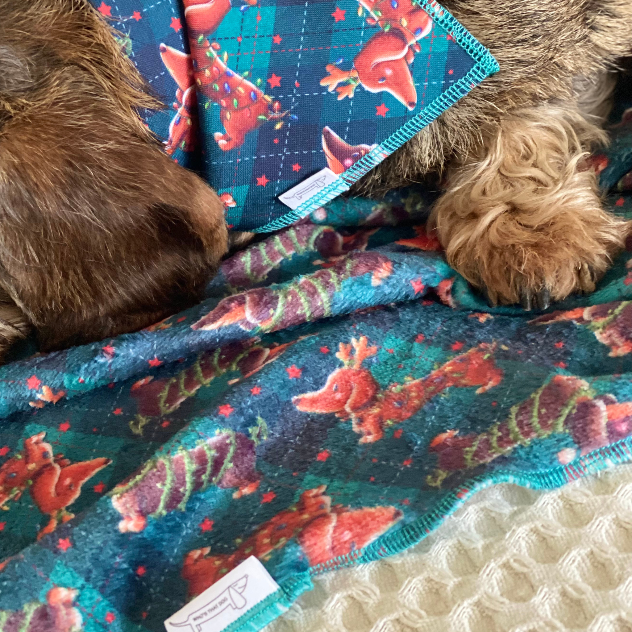 Ce duo foulard + plaid est une super idée cadeau pour les passionnés de teckels, mais aussi pour les propriétaires qui veulent assortir leur chien à leur décoration de Noël.